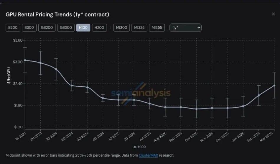 “GPU租赁是与计算相关的产品和服务中的一种,供应紧张导致价格飙升,一块H100一年的租赁合同价格从2025年10月的低点1.7美元/小时飙升至2026年3月的2.35美元/小时,涨幅近40%。”该报告称。