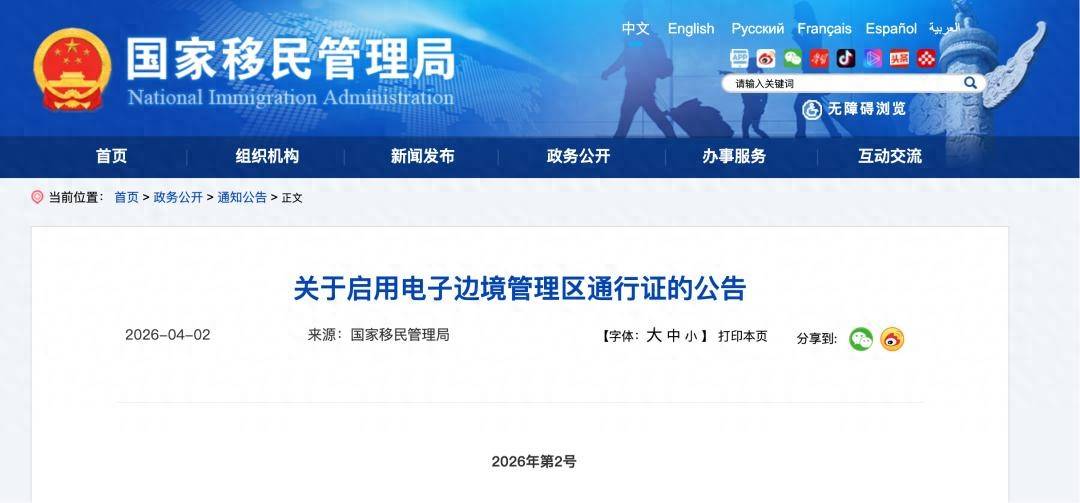 近日,国家移民管理局发布关于启用电子边境管理区通行证的公告,全文如下:
