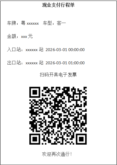 第一步:出口现金缴费后,收费员打印交易小票“现金支付行程单”交给客户。