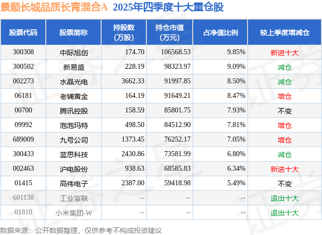 根据2025基金年报公募基金重仓股数据,重仓该股的公募基金共64家,其中持有数量最多的公募基金为景顺长城基金的景顺长城品质长青混合A。景顺长城品质长青混合A目前规模为62.11亿元,最新净值1.6884(4月8日),较上一交易日上涨5.22%,近一年上涨69.59%。该公募基金现任基金经理为农冰立。农冰立在任的基金产品包括:景顺长城北交所精选两年定开混合A,管理时间为2024年8月24日至今,期间收益率为125.63%;景顺长城新兴产业混合A,管理时间为2025年4月1日至今,期间收益率为66.22%;景顺长城成长同行混合,管理时间为2025年6月27日至今,期间收益率为18.18%。