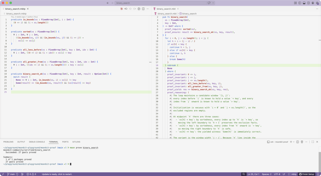 上图展示了 MoonBit 中对二分查找的完整验证。左侧是带有合约和循环不变量的函数实现,右侧是谓词定义文件,底部终端则显示验证全部通过。