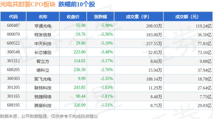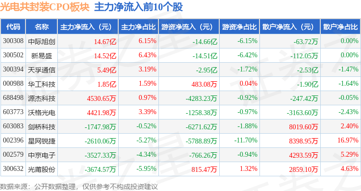 从资金流向上来看,当日光电共封装CPO板块主力资金净流出29.79亿元,游资资金净流出10.46亿元,散户资金净流入40.26亿元。光电共封装CPO板块个股资金流向见下表: