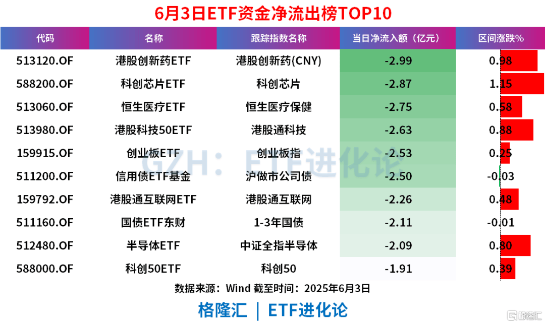 如港股创新药ETF、恒生医疗ETF分别净流出2.99亿元和2.75亿元。