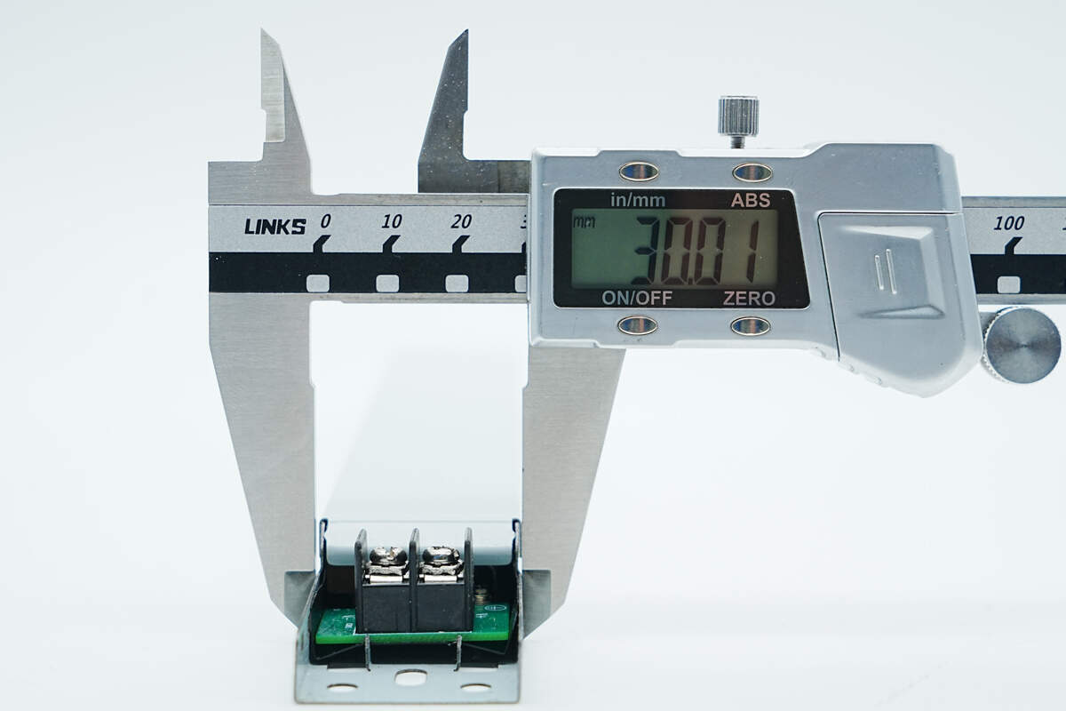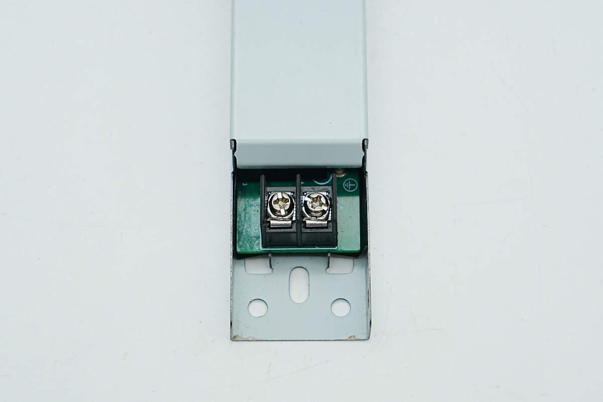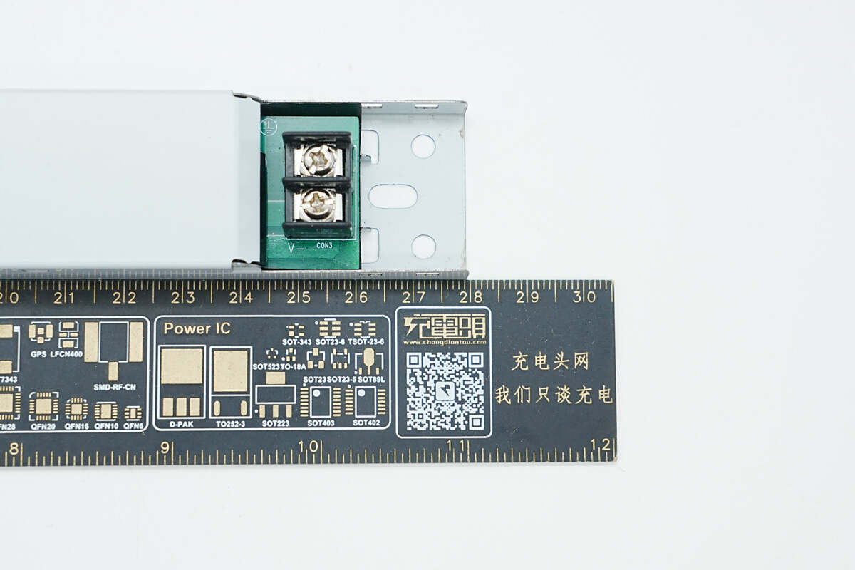 电源交流输入端子外露,金属壳端部打孔用于安装。