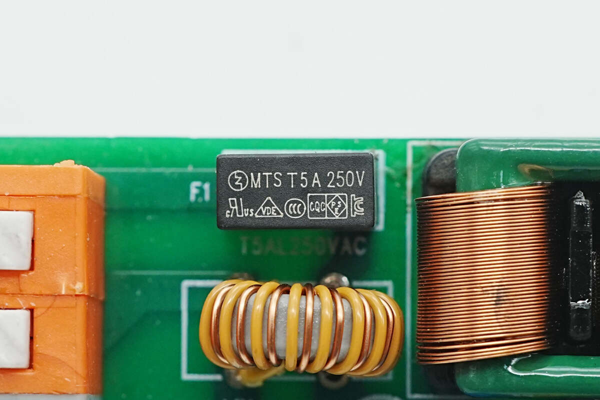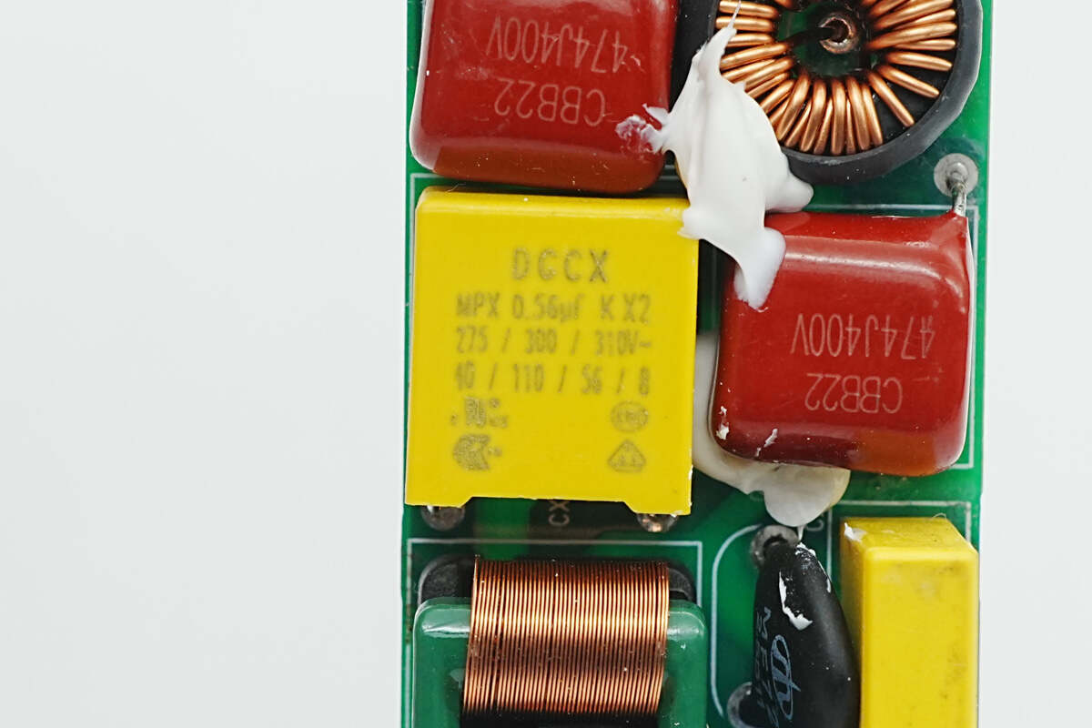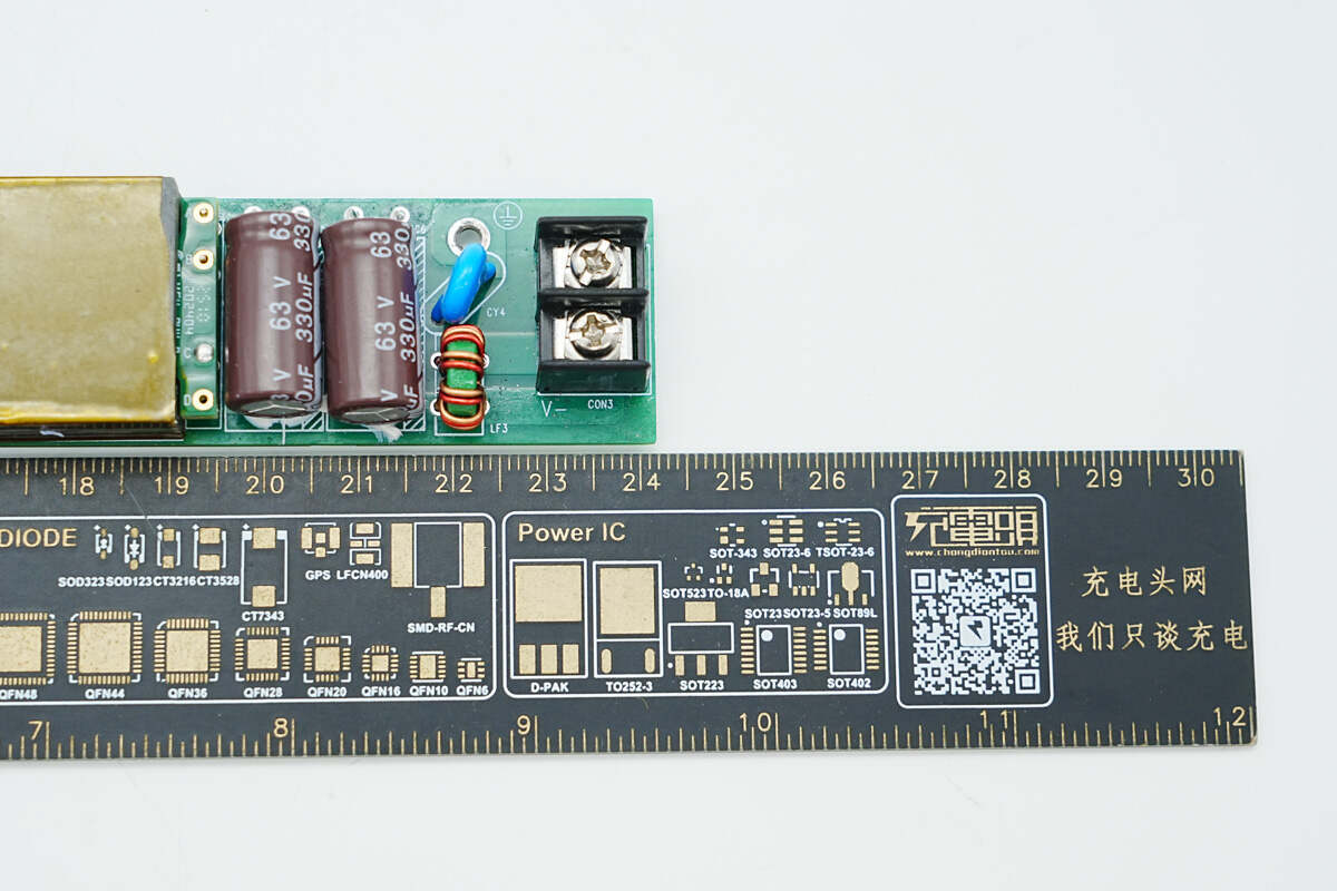 PCBA模块正面一览,焊接有延时保险丝,共模电感、安规X2电容、高压滤波电解电容、谐振电感、变压器等器件。