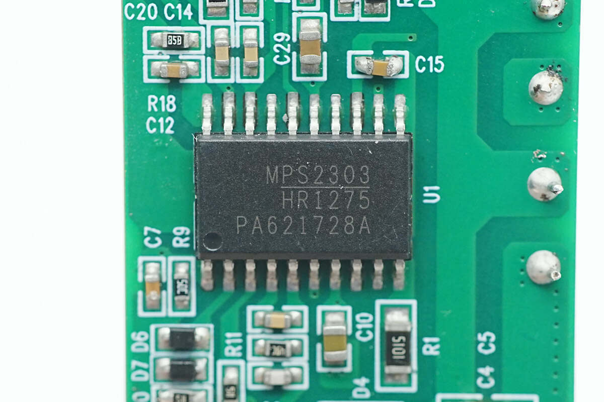 电源主控芯片来自MPS芯源系统,型号HR1275,是一颗采用临界和断续混合模式的PFC控制与电流模式LLC二合一数字控制器,可以通过UART接口配置。芯片内置节电技术,可以帮助实现整个工作范围内的效率优化。芯片内置高压启动和X电容放电,并支持PG信号输出。