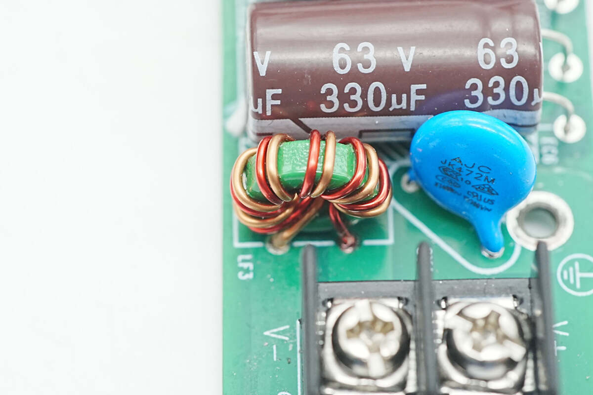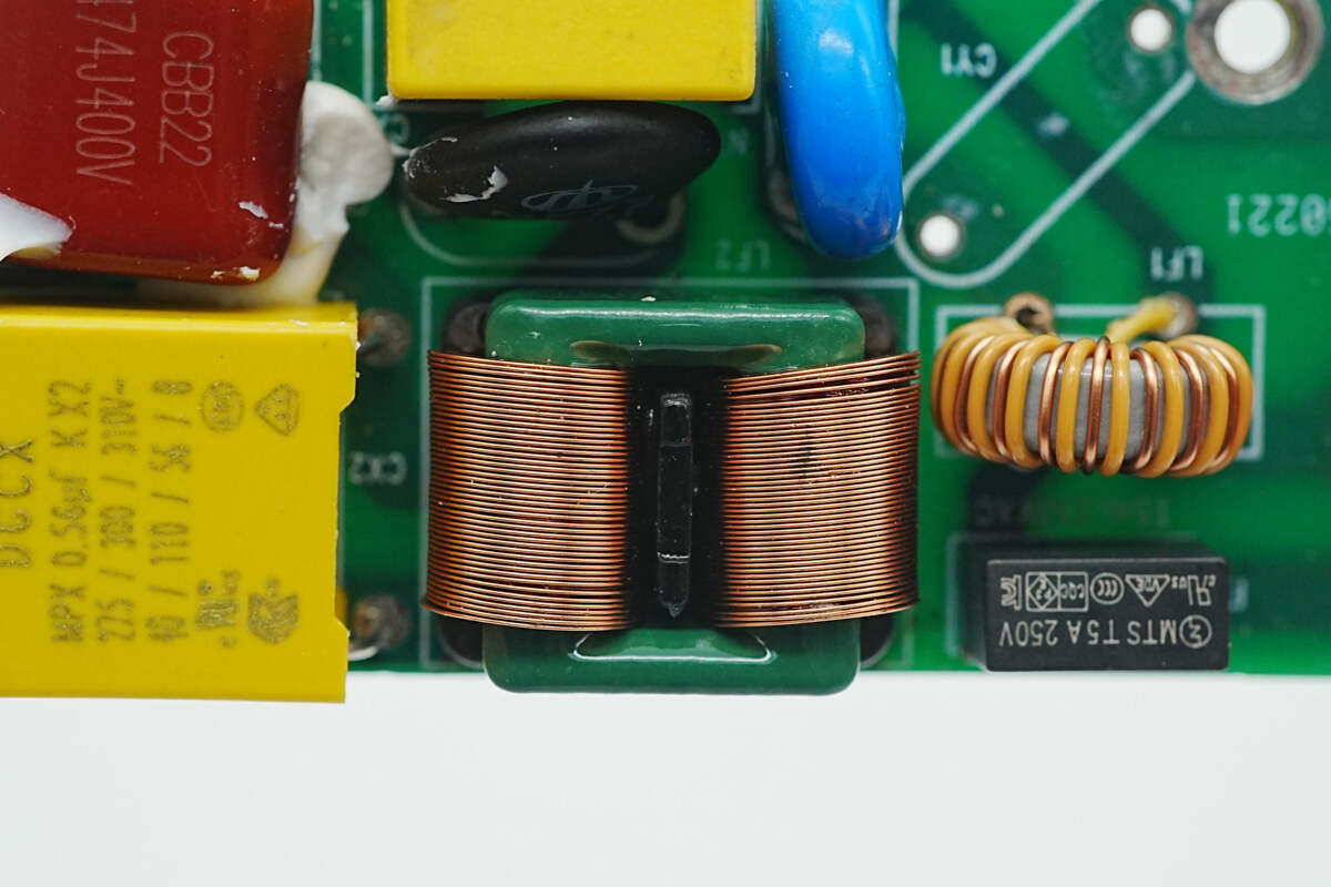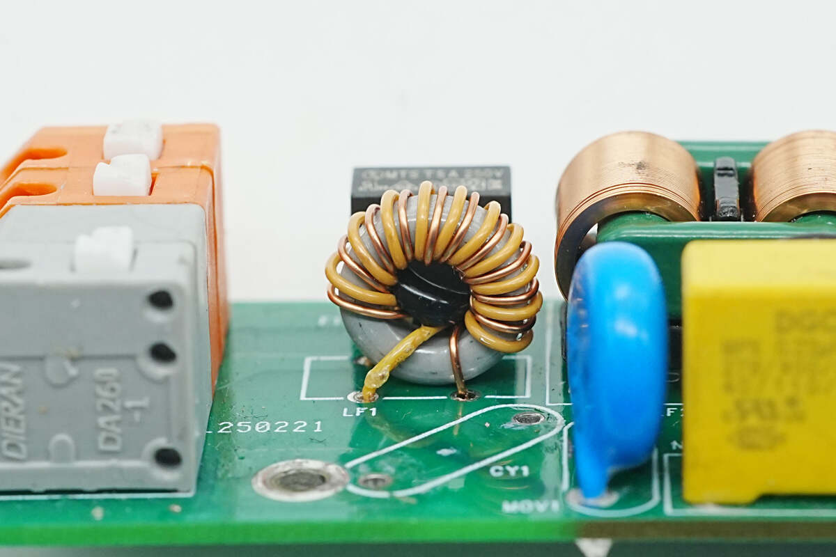 共模电感两级设计更好滤除EMI干扰,这颗采用绿色磁芯绕制。