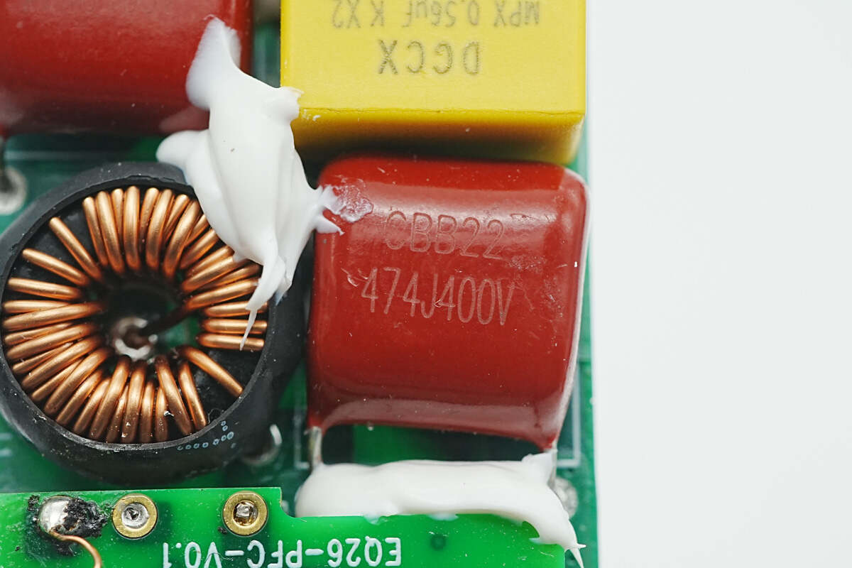PCBA模块正面滤波电容、电感等器件打胶固定,PFC电感、谐振电感和LLC变压器上均贴有导热垫,麦拉片对应整流桥等核心发热器件处也设有导热垫。