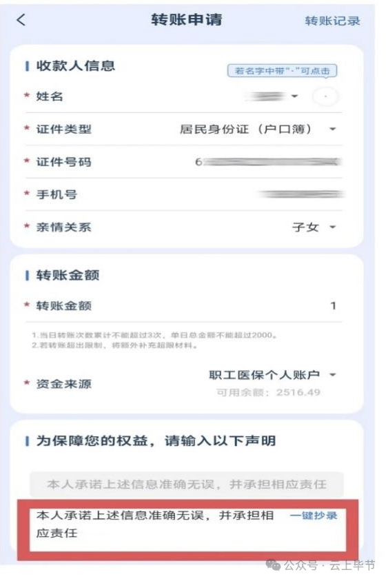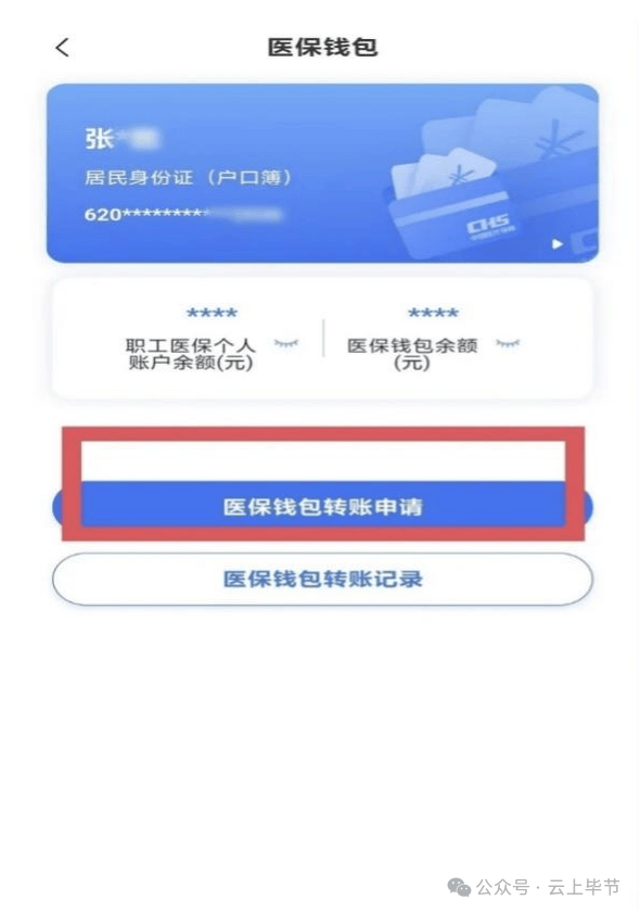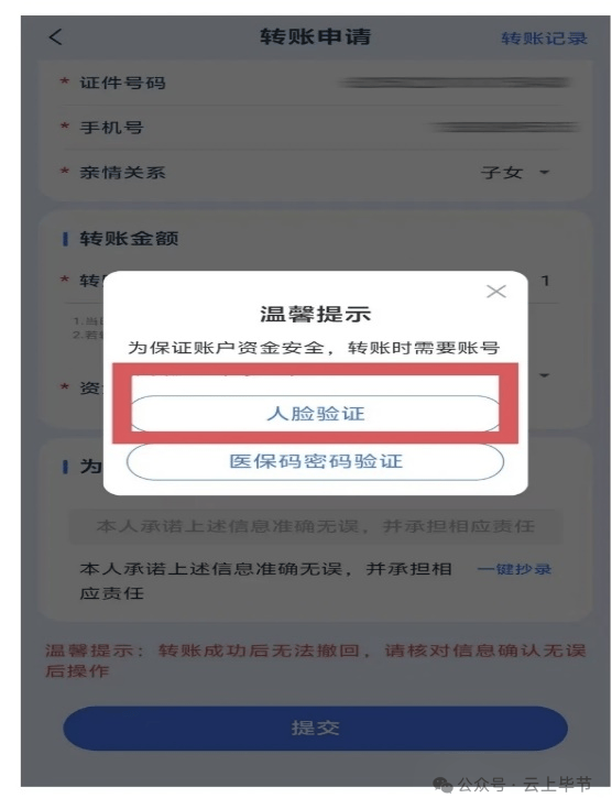 1.点击医保钱包转账申请-完善转账信息(红色*为必填项)-进行支付认证(两种方式:人脸认证和输入医保码密码皆可)-转账成功页面显示 。