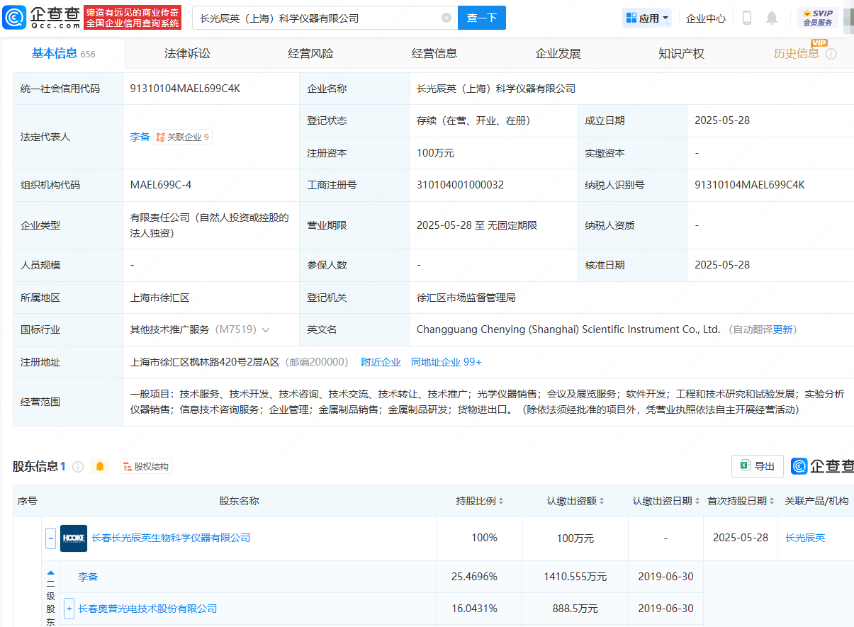 企查查APP显示,近日,长光辰英(上海)科学仪器有限公司成立,法定代表人为李备,注册资本为100万元,经营范围包含:光学仪器销售;会议及展览服务;软件开发;工程和技术研究和试验发展;实验分析仪器销售;信息技术咨询服务;企业管理等。企查查股权穿透显示,该公司由长春长光辰英生物科学仪器有限公司全资持股,后者由李备、奥普光电(002338)等共同持股。