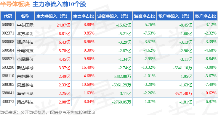 从资金流向上来看,当日半导体板块主力资金净流入70.76亿元,游资资金净流出54.78亿元,散户资金净流出15.98亿元。半导体板块个股资金流向见下表: