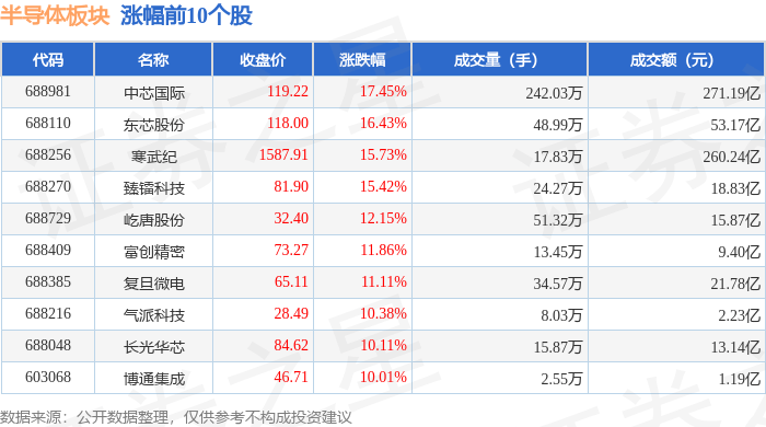 证券之星消息,8月28日半导体板块较上一交易日上涨6.79%,中芯国际领涨。当日上证指数报收于3843.6,上涨1.14%。深证成指报收于12571.37,上涨2.25%。半导体板块个股涨跌见下表: