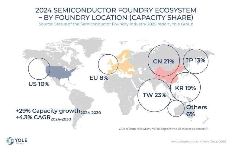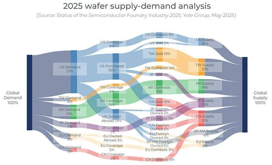 另外,机构也统计了当前各大国家和地区本土的实际晶圆需求,认为美国实际是高达57%的,但只有10%的产能,所以47%是要靠国外企业提供代工服务的。