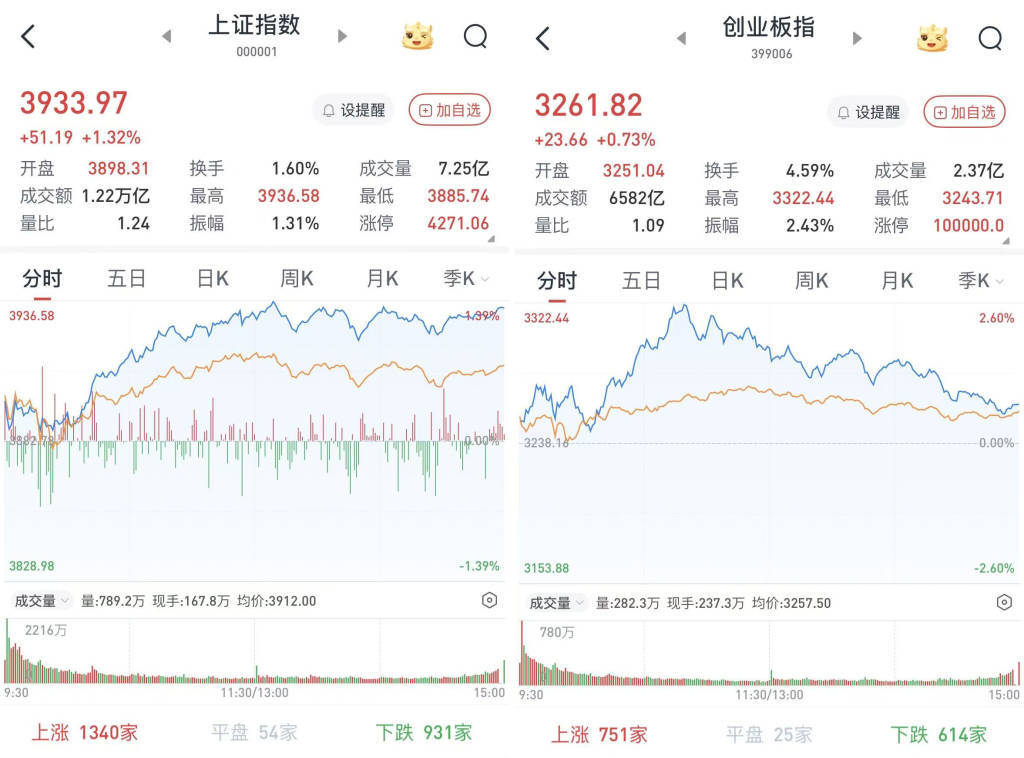 至收盘,上证综指涨1.32%,报3933.97点;科创50指数涨2.93%,报1539.08点;深证成指涨1.47%,报13725.56点;创业板指涨0.73%,报3261.82点。