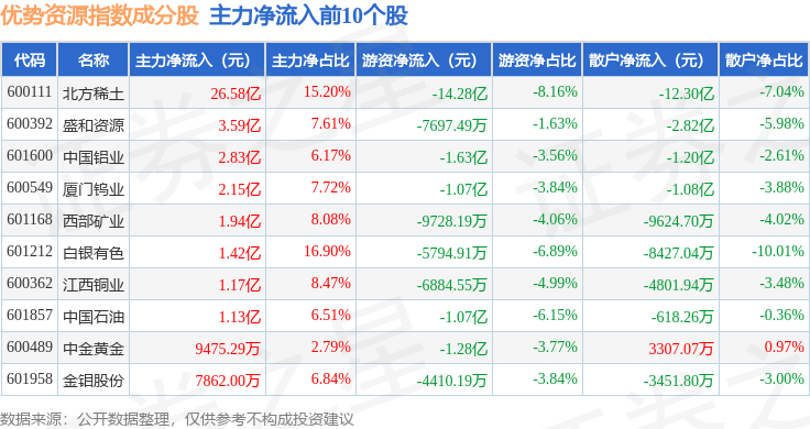 资金流向方面,优势资源(000145)指数成份股当日主力资金净流入合计14.79亿元,游资资金净流出合计11.19亿元,散户资金净流出合计3.6亿元。成份股资金流向详情见下表: