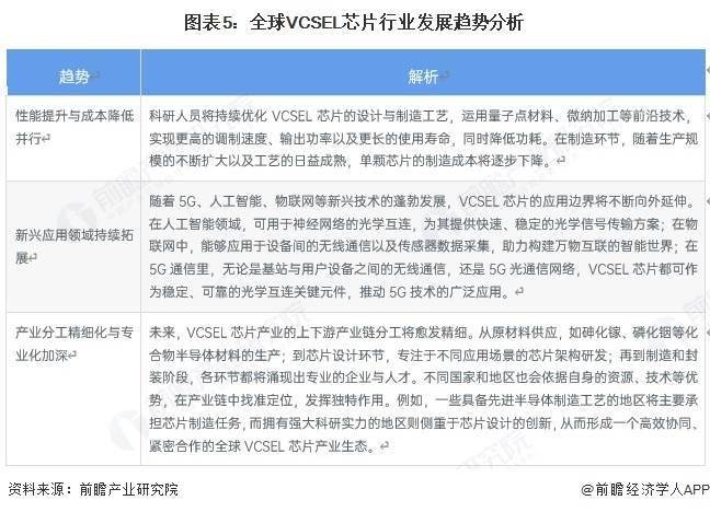 全球VCSEL芯片行业未来将呈现性能与成本双向优化、应用领域持续拓展、产业分工不断精细化的发展趋势,通过技术升级提升芯片性能并降低成本以适配更多场景,依托新兴技术拓展在人工智能、物联网等领域的应用,同时产业链各环节专业化分工加深,形成高效协同的全球产业生态。
