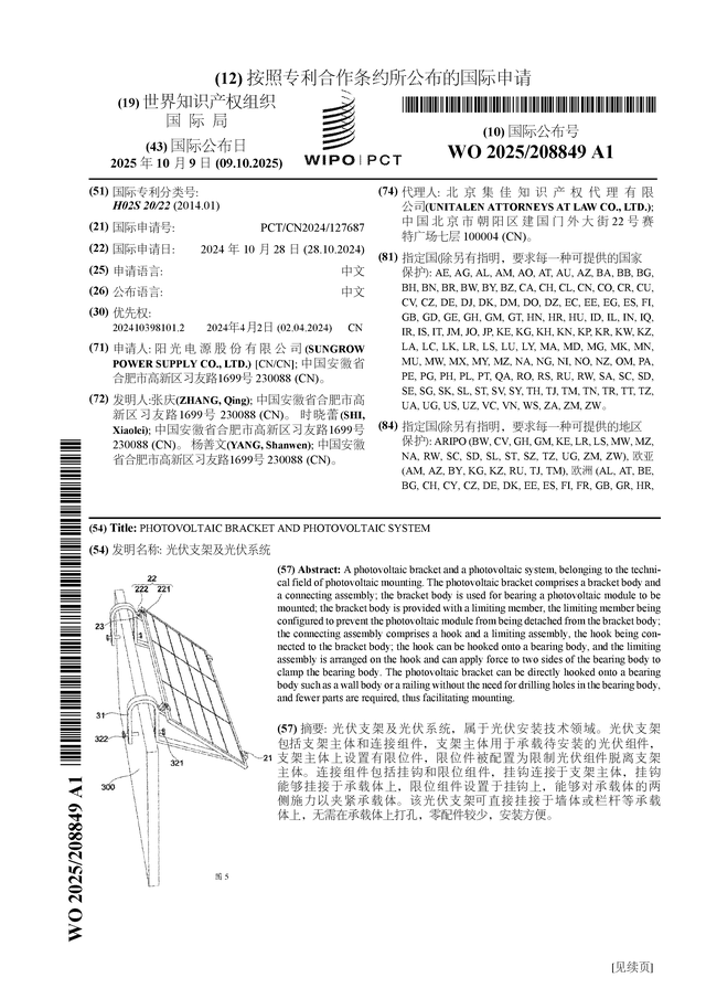 证券之星消息,根据企查查数据显示阳光电源(300274)公布了一项国际专利申请,专利名为“光伏支架及光伏系统”,专利申请号为PCT/CN2024/127687,国际公布日为2025年10月9日。