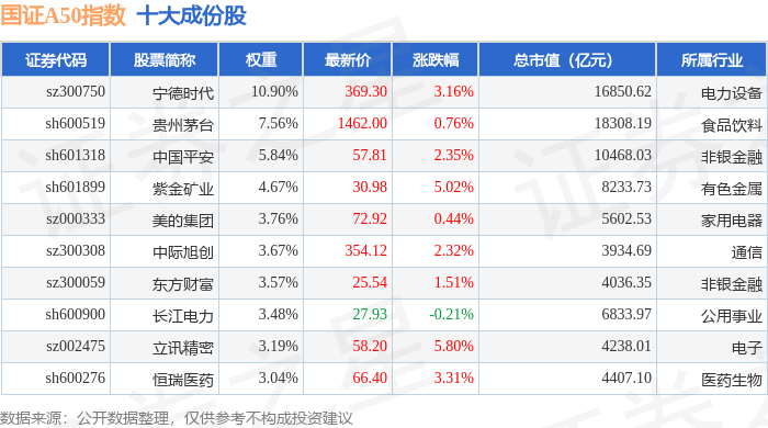 国证A50(399310)指数十大成份股详情如下: