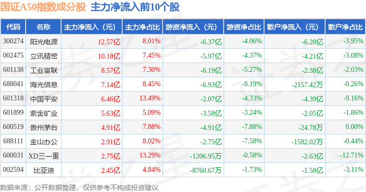 资金流向方面,国证A50(399310)指数成份股当日主力资金净流入合计67.56亿元,游资资金净流出合计46.07亿元,散户资金净流出合计21.49亿元。成份股资金流向详情见下表: