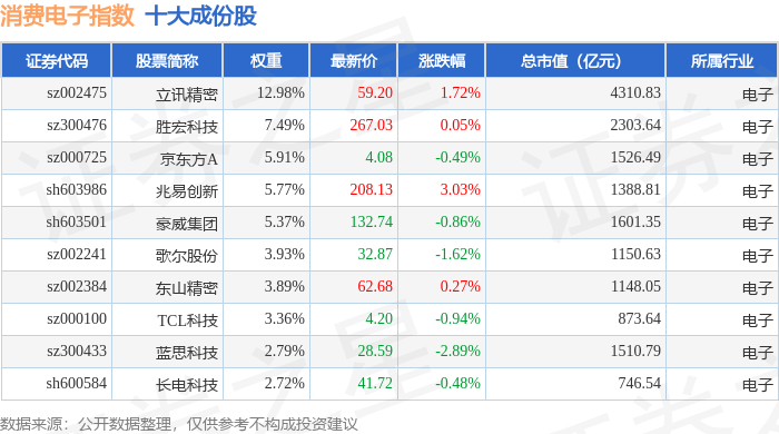 证券之星消息,10月16日,消费电子(980030)指数报收于7229.33点,跌0.35%,成交1048.22亿元,换手率2.21%。当日该指数成份股中,上涨的有12家,佰维存储以8.76%的涨幅领涨,下跌的有38家,领益智造以3.51%的跌幅领跌。