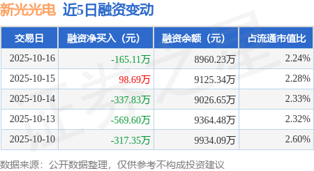 证券之星消息,10月16日,新光光电(688011)融资买入468.6万元,融资偿还633.71万元,融资净卖出165.11万元,融资余额8960.23万元。
