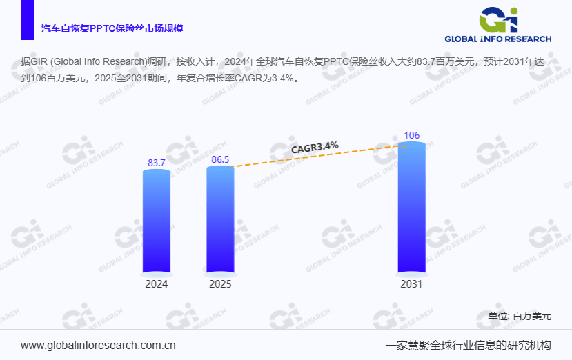市场规模稳步增长,七年增长空间明确。据 Global Info Research(环洋市场咨询)2025 年 10 月 17 日发布的专项报告显示,按收入计,2024 年全球汽车自恢复 PPTC 保险丝市场收入已达 83.7 百万美元。受益于汽车电子化率提升及新能源汽车普及,市场将持续扩容,预计 2031 年规模将攀升至 106 百万美元,2025 至 2031 年间年复合增长率稳定在 3.4%,为行业参与者提供了清晰的增长预期。