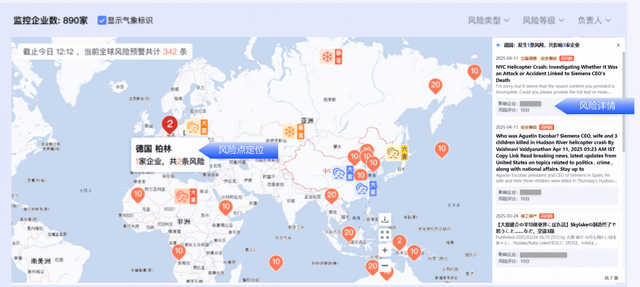 其中,“世界风险地图”作为全天候智能预警平台,能将风险事件与供应商的地理位置实时关联,自动生成动态的全球风险热力图,让不同区域的风险分布情况以及受影响供应商数量直观呈现。该平台的风险监测范围覆盖全球220多个国家和地区,支持130多种语言的实时翻译,接入了包括各国地震局、气象局及主流媒体等在内的超30万个多渠道数据源,可对原材料供应、生产经营、物流运输等方面的181项供应中断风险进行监测,助力企业全面了解全球供应链风险状况。