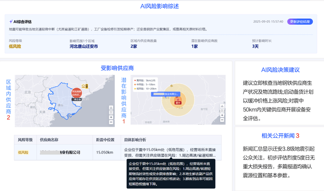以地震风险为例,启信慧眼能够实时推送震中位置、震级、受影响供应商等关键信息,标注出预计影响时长,并结合历史地震数据与专业评估模型,预测地震对供应链可能造成的冲击,给出具体的决策建议。例如,某地发生3.8级地震时,AI会综合多方面信息对风险进行评级,明确标注“两家供应商受影响、预计影响时间3天”等重要内容,同时建议企业立即核查当地供应商的生产情况及物流路线、启动备货计划以应对可能出现的价格上涨风险、对震中50公里内的关键供应商开展设备安全评估等。