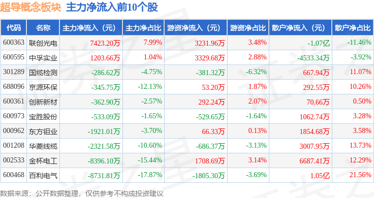 从资金流向上来看,当日超导概念板块主力资金净流出18.4亿元,游资资金净流入3.13亿元,散户资金净流入15.27亿元。超导概念板块个股资金流向见下表: