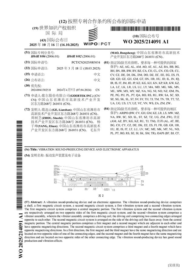 证券之星消息,根据企查查数据显示歌尔股份(002241)公布了一项国际专利申请,专利名为“振动发声装置及电子设备”,专利申请号为PCT/CN2025/083034,国际公布日为2025年10月16日。