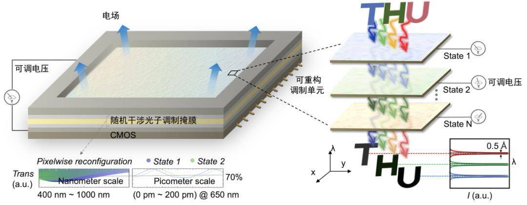 “我们提出可重构计算光学成像架构,将物理分光限制转化为光子调制与重建过程,挖掘随机干涉掩膜与铌酸锂材料的电光重构特性,实现了高维光谱调制与高通量解调的协同计算。”方璐介绍,团队由此研制出亚埃米级高分辨光谱成像芯片——“玉衡”,无需在波长维度牺牲通量,每个像素均可获取完整光谱信息,快照光谱成像的分辨能力提升两个数量级,突破了光谱分辨率与成像通量无法兼得的长期瓶颈。