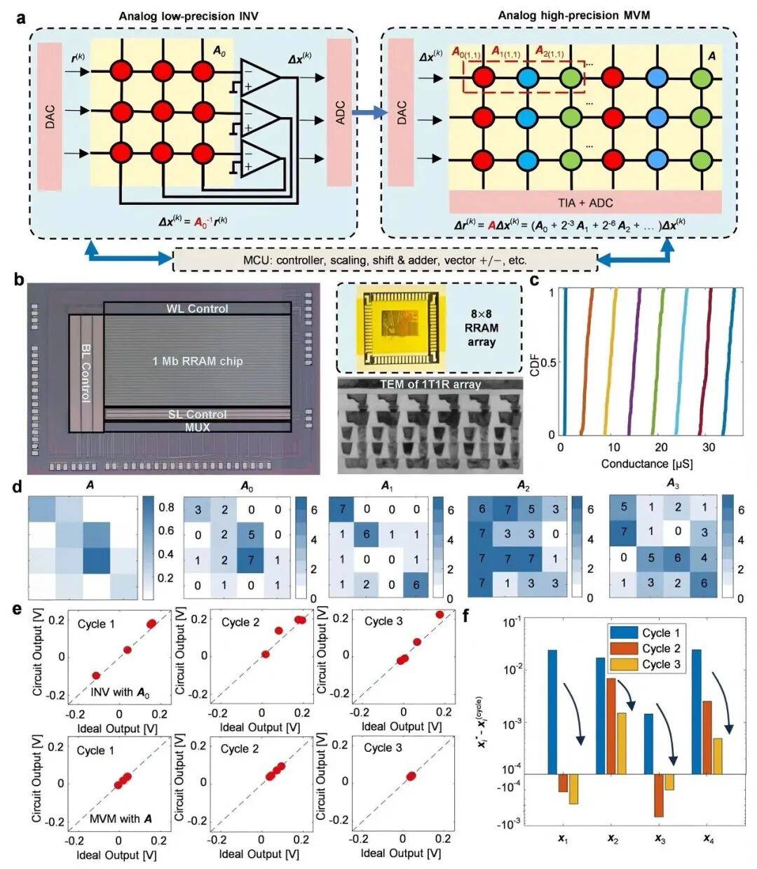 面对这一挑战,研究团队选择了一条融合创新的道路,他们通过新型信息器件、原创电路和经典算法的协同设计,首次实现了在精度上可与数字计算媲美的模拟计算系统,将传统模拟计算的精度提升了五个数量级。“我们研发的新方案在保持模拟计算低复杂度优势的同时,实现了与数字FP32处理器相媲美的计算精度。团队还提出了块矩阵模拟计算方法,像拼图一样将大问题分解到多个芯片上协同解决,成功突破了模拟计算的规模限制,实验实现了16×16矩阵方程的求解。”