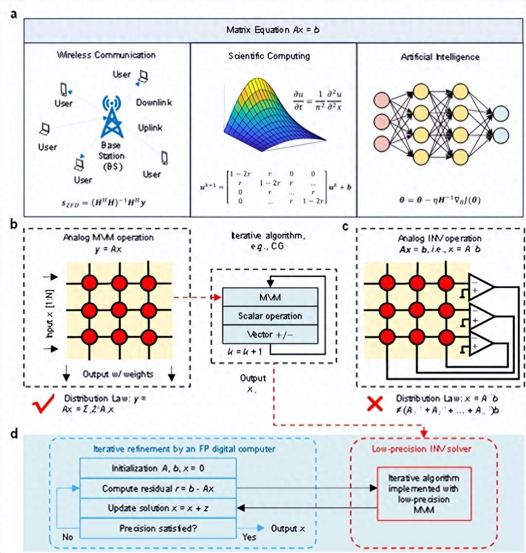 论文通讯作者孙仲表示,模拟计算是早期计算机的核心技术,通过物理定律直接运算,具有高并行、低延时、低功耗的先天优势。然而,由于传统模拟计算精度低、难扩展,逐渐被高精度、可编程的数字计算取代,成为存于教科书中的“老旧技术”。“如何让模拟计算兼具高精度与可扩展性,从而在现代计算任务中发挥其先天优势,一直是困扰全球科学界的‘世纪难题’。数字计算虽精度高,但计算速度慢,同时存在冯·诺依曼架构的‘内存墙’问题,已成为人工智能、科学计算和6G通信发展的瓶颈。”