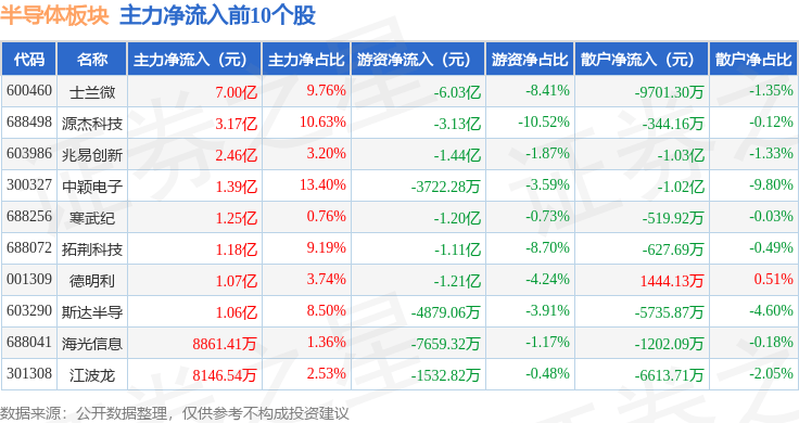 从资金流向上来看,当日半导体板块主力资金净流出23.7亿元,游资资金净流出8.66亿元,散户资金净流入32.36亿元。半导体板块个股资金流向见下表: