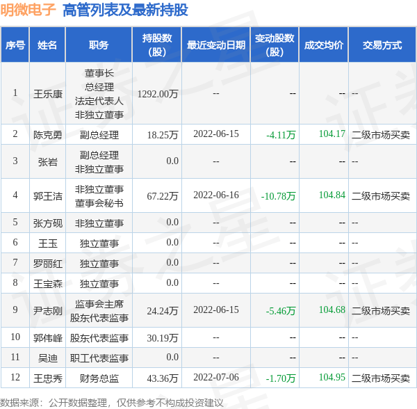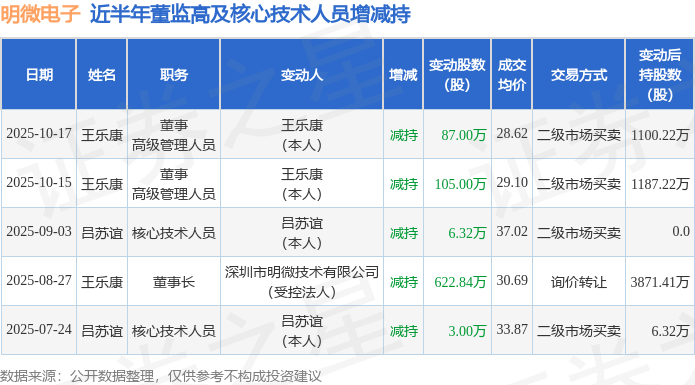 明微电子近半年内的董监高及核心技术人员增减持详情如下: