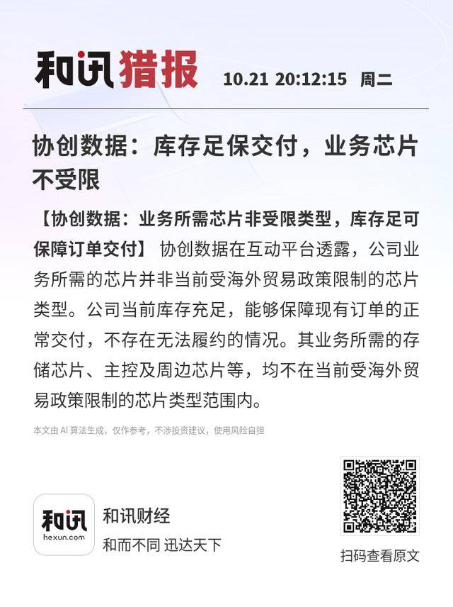 【协创数据:业务所需芯片非受限类型,库存足可保障订单交付】协创数据在互动平台透露,公司业务所需的芯片并非当前受海外贸易政策限制的芯片类型。公司当前库存充足,能够保障现有订单的正常交付,不存在无法履约的情况。其业务所需的存储芯片、主控及周边芯片等,均不在当前受海外贸易政策限制的芯片类型范围内。
