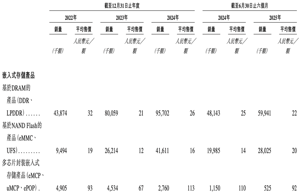 2022年、2023年、2024年、2025年1-6月,晶存科技嵌入式存储产品的销量分别为0.58亿颗、1.11亿颗、1.40亿颗、0.88亿颗。
