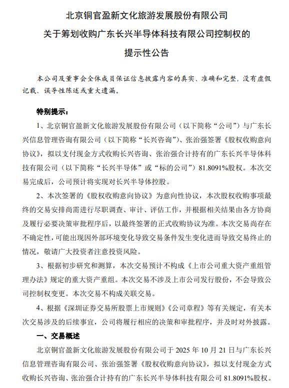 盈新发展(000620.SZ)发布公告,公司与广东长兴信息管理咨询有限公司、张治强签署了《股权收购意向协议》,计划以支付现金方式收购其合计持有的广东长兴半导体科技有限公司81.8091%股权。本次交易完成后,公司预计将实现对长兴半导体控股。