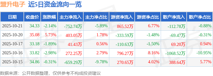 证券之星消息,截至2025年10月21日收盘,盟升电子(688311)报收于34.33元,下跌2.14%,换手率2.2%,成交量3.69万手,成交额1.28亿元。
