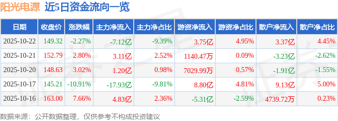 证券之星消息,截至2025年10月22日收盘,阳光电源(300274)报收于149.32元,下跌2.27%,换手率3.19%,成交量50.76万手,成交额75.82亿元。