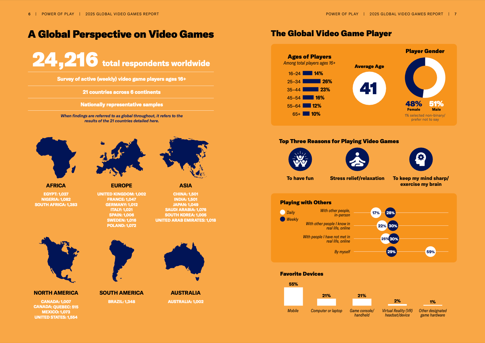 本次调研对象总计24,216人,覆盖全球6大洲21个国家。受访者平均年龄41岁,男女比例基本持平(48%女性 vs.51%男性)。相比其他游戏类型,手机游戏最受玩家青睐(占比55%)。 图片来源:报告原文