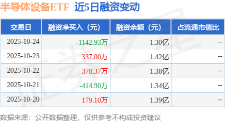 证券之星消息,10月24日,半导体设备ETF(561980)融资买入2360.37万元,融资偿还3503.3万元,融资净卖出1142.93万元,融资余额1.3亿元,近20个交易日中有11个交易日出现融资净买入。