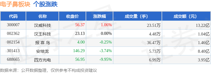 证券之星消息,10月27日电子鼻板块较上一交易日下跌1.99%,四方光电领跌。当日上证指数报收于3996.94,上涨1.18%。深证成指报收于13489.4,上涨1.51%。电子鼻板块个股涨跌见下表:
