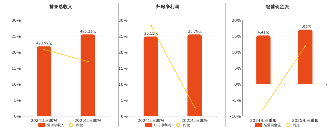 公司营业总收入为496.21亿元。归母净利润为23.76亿元。经营活动现金净流入为4.93亿元。