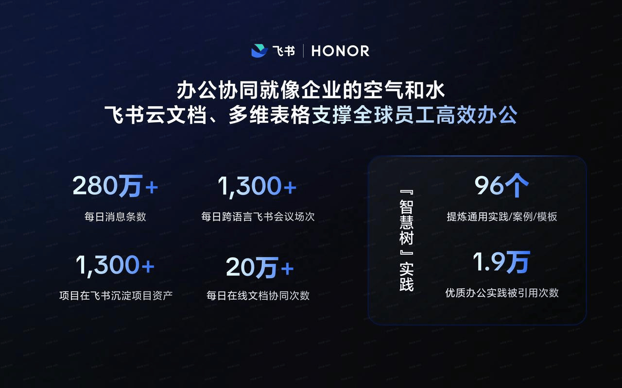 荣耀流程 IT 与运营质量运营部部长张书亮表示,荣耀选择飞书,是选择了一种"在线化、协同化、智慧化"的全新工作模式。在跨时区、跨语言的全球协作中,飞书通过实时翻译等能力,有效解决了国际化团队的沟通障碍。张书亮形容,办公协同就像企业的“空气和水”,而飞书正是提供了这种无处不在的基础能力:飞书云文档、多维表格支撑全球员工高效办公。目前,荣耀协同文档量已达1500万篇,日均消息量280万次,日均在线文档使用20万次。