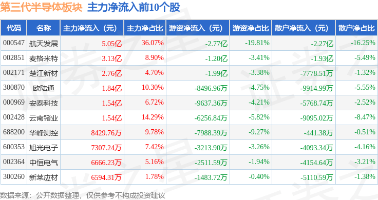 从资金流向上来看,当日第三代半导体板块主力资金净流出51.11亿元,游资资金净流入9.0亿元,散户资金净流入42.11亿元。第三代半导体板块个股资金流向见下表: