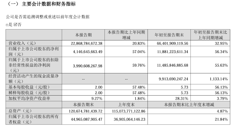 - 第三季度营收为228.69亿元,同比增长20.83%;