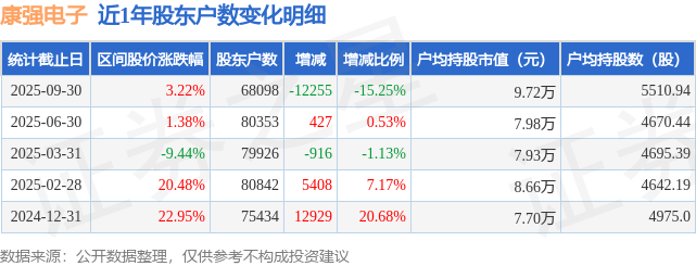 从股价来看,2025年6月30日至2025年9月30日,康强电子区间涨幅为3.22%,在此期间股东户数减少1.23万户,减幅为15.25%。