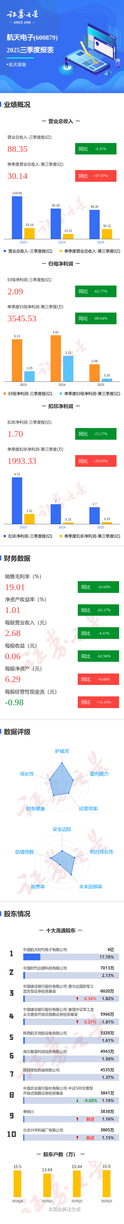 证券之星消息,航天电子2025年三季报显示,前三季度公司主营收入88.35亿元,同比下降4.32%;归母净利润2.09亿元,同比下降62.77%;扣非净利润1.7亿元,同比下降15.17%;其中2025年第三季度,公司单季度主营收入30.14亿元,同比上升97.97%;单季度归母净利润3545.53万元,同比下降88.65%;单季度扣非净利润1993.33万元,同比上升29.93%;负债率49.99%,投资收益-1456.39万元,财务费用9671.91万元,毛利率19.01%。