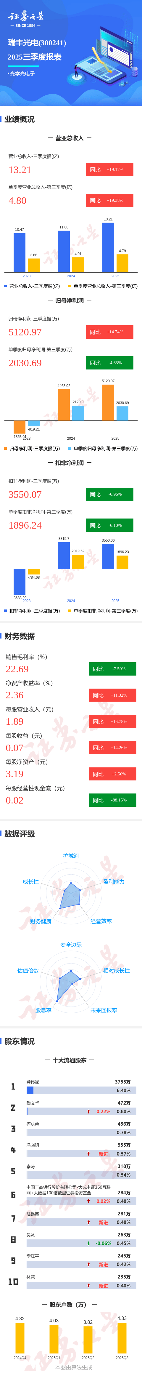 证券之星消息,瑞丰光电2025年三季报显示,前三季度公司主营收入13.21亿元,同比上升19.18%;归母净利润5120.97万元,同比上升14.74%;扣非净利润3550.07万元,同比下降6.96%;其中2025年第三季度,公司单季度主营收入4.8亿元,同比上升19.39%;单季度归母净利润2030.69万元,同比下降4.66%;单季度扣非净利润1896.24万元,同比下降6.11%;负债率38.14%,投资收益218.78万元,财务费用635.15万元,毛利率22.69%。